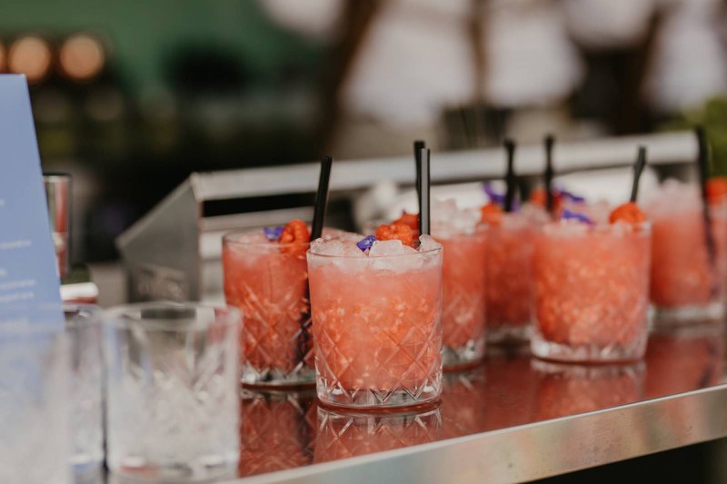 Extra fun: have a lemonade bar put on, with different kinds of refreshing lemonades whose glasses you decorate with pieces of fruit from your styling. Of course, a nice refreshing cocktail (or mocktail) is also always popular.