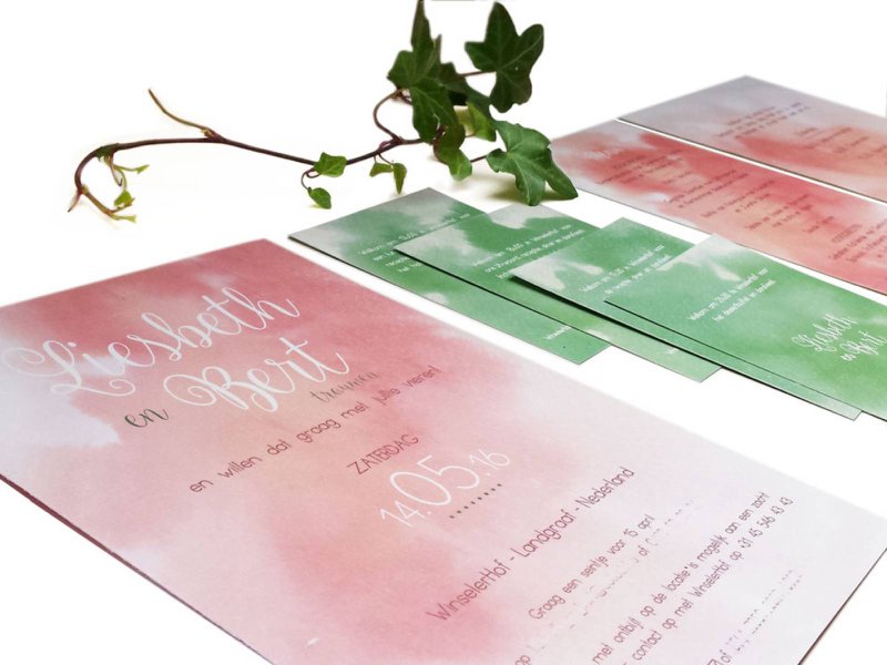Totally in line with your spring wedding: watercolours for your stationery. The soft and fleeting in pastel watercolours in orange, yellow and pink give your invitations that romantic yet fresh feel. If you choose shades of azure and green, you'll create a more spirited spring look.