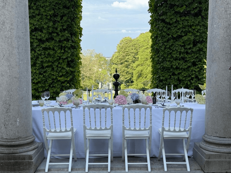 The estate can be fully adapted to the wishes of each couple. Alexia: "The ceremony can take place in the park, surrounded by centuries-old trees, or in the loggia, a beautiful terrace area with impressive columns. Dinner is often served in the Ora Rossa marquee in the park, surrounded by glass and bathed in light, with a beautiful view of the castle. For more intimate weddings, the salons are ideal, with their elegant and refined atmosphere."