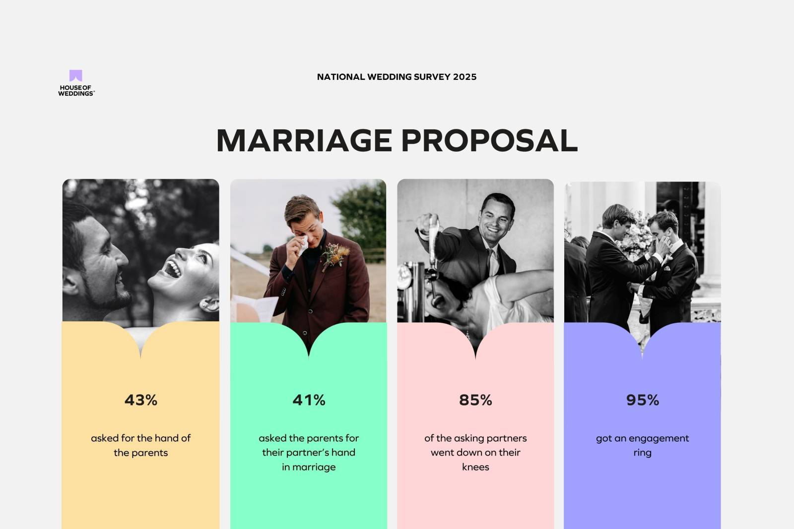 Immediately after the proposal, most couples take the time to enjoy the moment together, and only 2% post the news on social media first. The traditional “asking for the hand” from the parents was done by 45% in 2022, and among couples getting married in 2025, this is still 43% on average.