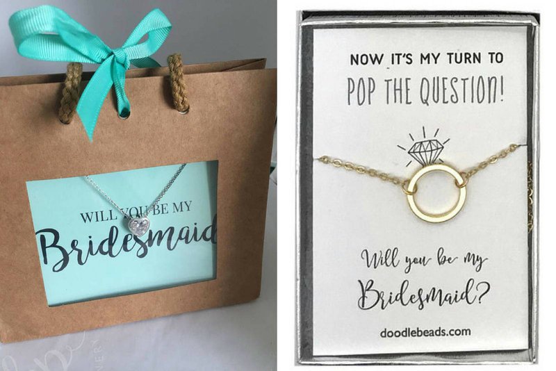 Find a cute little jewelry box and surprise your bridesmaids with a real proposal. You can surely find a beautiful ring or necklace with the initials of your future bridesmaids. During your wedding, they can pimp their outfit with their personalized gift, and afterwards, they'll have a great reminder of your smashing wedding party!