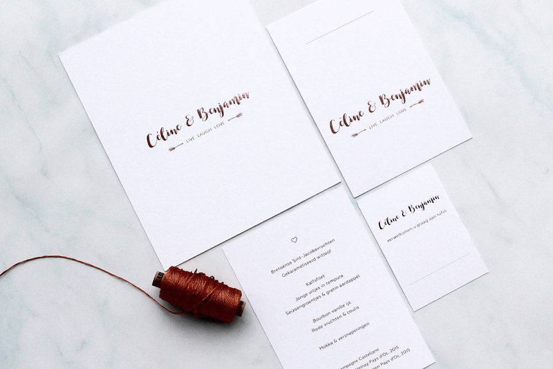 L'impression d'une fête de mariage ne se limite pas à l'invitation. Pensez aussi aux menus, aux noms des tables, aux cartes nominatives pour l'arrangement de la table, au plan de table, à la carte de cérémonie ou au livret, à une carte de remerciement, ... Ça fait la différence quand tous les détails ont été bien pensés !