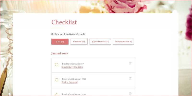 Comptez jusqu'au bout avec nos checks soigneusement répertoriés par mois - et plus précis : par semaine, par jour. Alors, sans stress et bien à l'avance, gardez à l'esprit toutes les choses que vous devez faire. En outre, nous faisons la distinction entre les éléments essentiels et les éléments moins essentiels, ainsi que les formalités qui comptent après le jour du mariage. Nos conseils ? Personnalisez votre liste de tâches pendant que vous y êtes ! Supprimez ce dont vous n'avez pas besoin - si vous travaillez avec un wedding planner, par exemple - et cochez ce que vous avez déjà fait. Keep calm et profitez pleinement l'un de l'autre. Bonne chance !