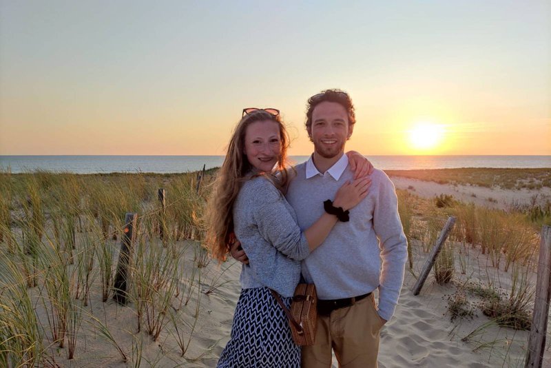 Un jour, lors d'une randonnée, ils se sont retrouvés dans les dunes. Sophie raconte : "C'était très beau là-bas parce qu’il y avait un chemin de sable qu’on pouvait suivre vers la mer. Des deux côtés de ce chemin on voyait des plantes et donc, lorsqu’on marchait vers la mer, l’ensemble formait une sorte de « U » dans lequel le soleil se couche le soir. Malheureusement le jour où nous sommes passés, il ne faisait pas très beau, il n’y avait donc pas de soleil, alors j'ai dit à Matthieu : « S'il fait beau, je veux venir ici et prendre des photos, parce que cet endroit est vraiment magnifique ! » Cette phrase résonnait comme de la musique aux oreilles de Matthieu, car Sophie venait de choisir l'endroit où il pourrait lui demander de l'épouser...