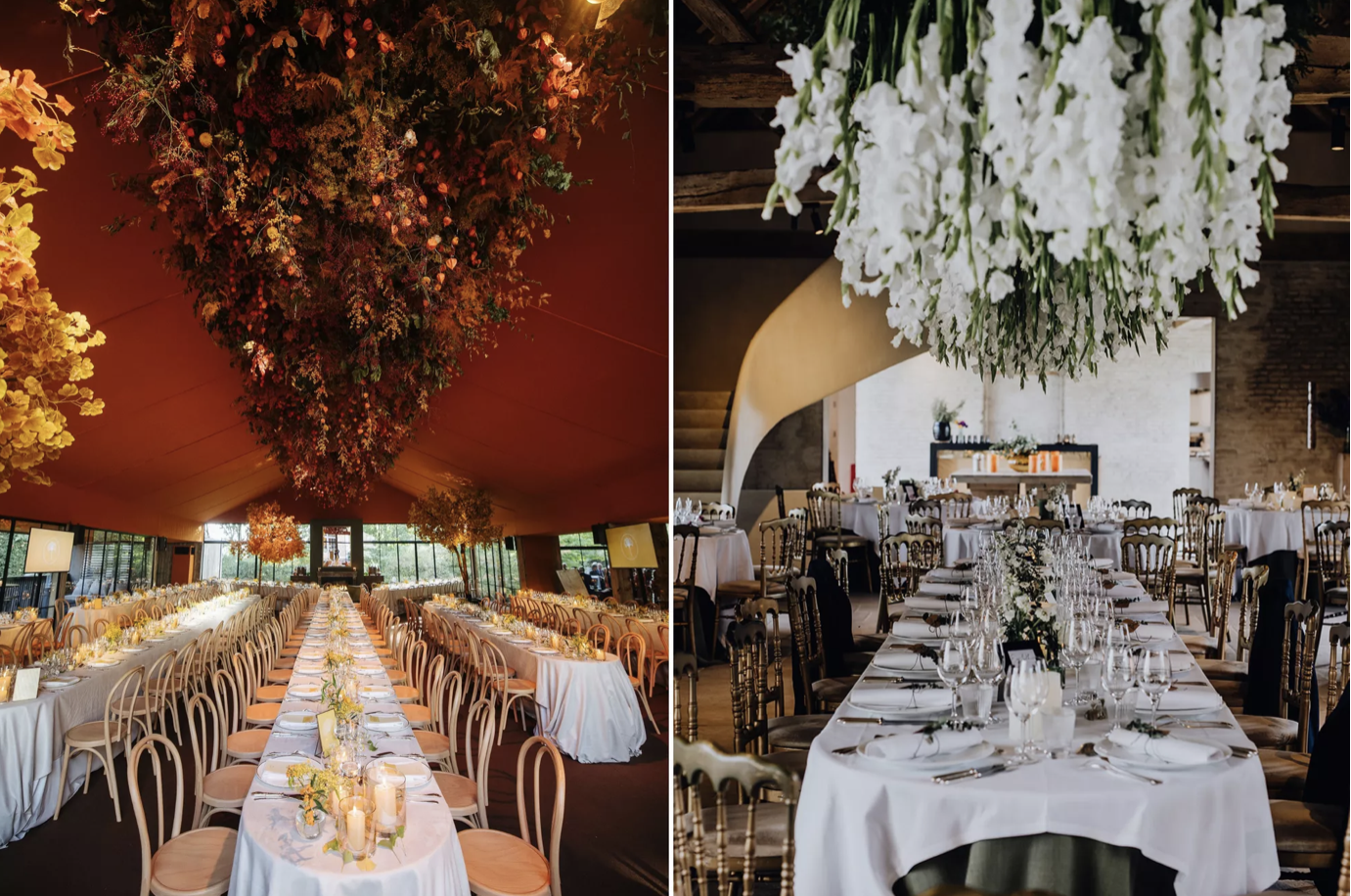 Enfin, la décoration florale " flottante " est également l'une des principales tendances florales de 2023. Diederik de VIVA Blooming déclare : "Ces derniers temps, je reçois de plus en plus de demandes pour suspendre des décorations florales dans les airs. Les 'nuages de fleurs' sont très amusants à cet égard. J'essaie toujours d'être créatif pour répondre à cette demande et je trouve souvent d'autres idées qui correspondent tout à fait au style des mariés. Par exemple, j'ai déjà réalisé une immense pièce de plafond de 12 mètres carrés sur 2". D'autres grandes décorations florales telles que les "arceaux de fleurs" - arcs de fleurs circulaires - et les paniers suspendus remplis de vos fleurs préférées sont également possibles. Votre fleuriste se fera certainement un plaisir de vous aider à cet égard !