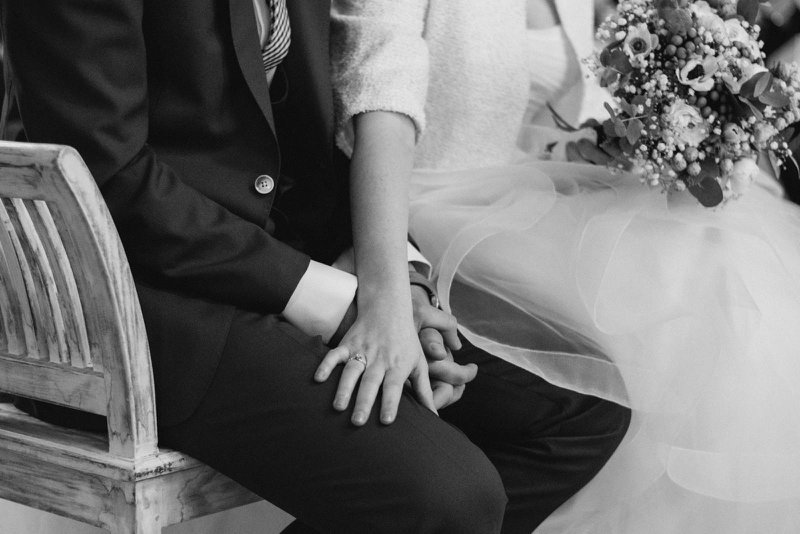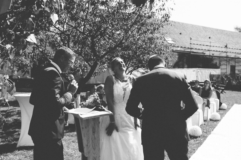 En Belgique, vous vous dites officiellement « oui » devant l'officier de l'état civil de la commune ou de la ville où vous vous mariez. Mais ceux qui organisent en plus une cérémonie séparée peuvent également donner leur propre interprétation de l’échange des consentements. L'officiant lira ensuite un texte qui exprime exactement ce que le mariage signifie pour vous. Le « oui » est généralement scellé par l'échange d’alliances et d'un baiser.