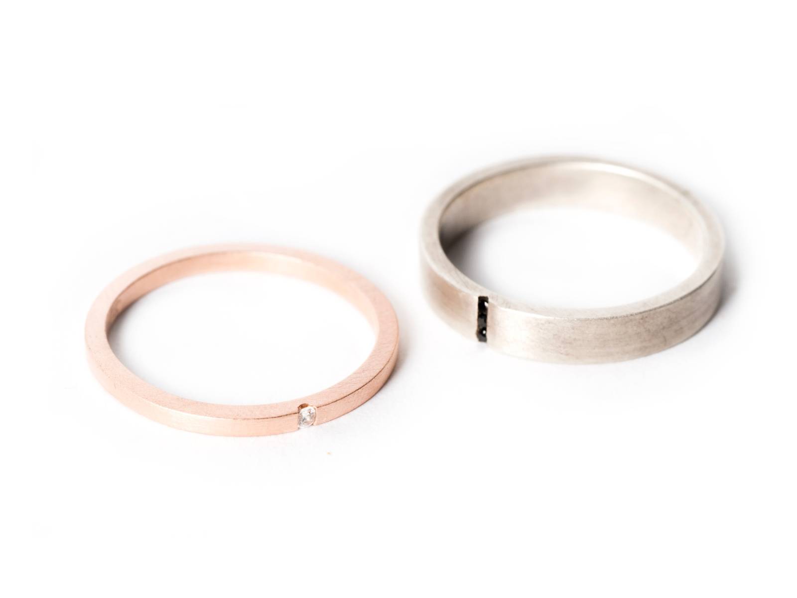 Elisa Lee propose d’une part des alliances minimalistes de la collection Yes I DO, en or massif 18 carats ou en zirconium et ornées de diamants équitables issus de territoires sans conflit.