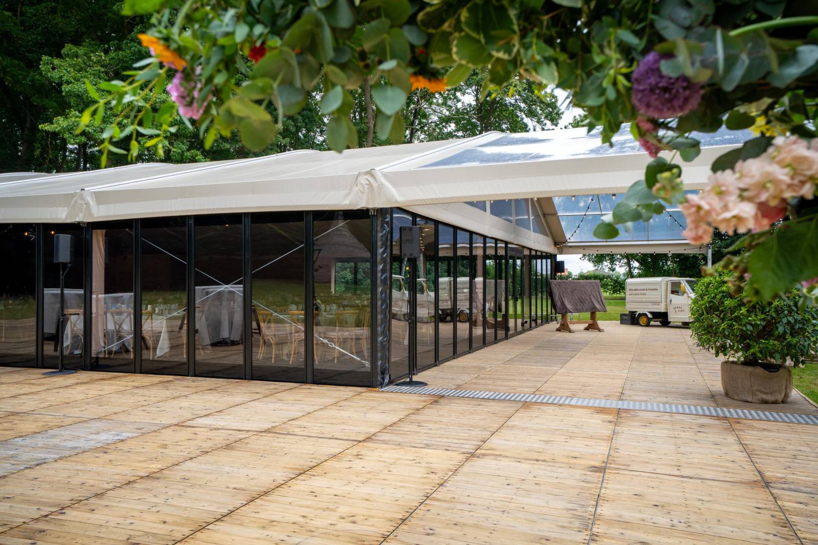 Pour une fête de mariage, NIMA Rent offre également la possibilité de décorer entièrement l'intérieur de la tente avec des tissus, des fenêtres en verre, de vraies portes et un plancher en bois soigné. Cela crée une atmosphère chaleureuse et luxueuse qui vous fait presque oublier que vous êtes dans une tente, tout en créant des souvenirs spéciaux avec vos invités.