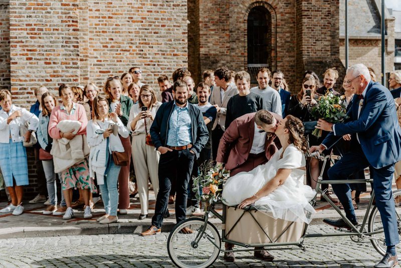 Een onverwachte, maar ontzettend originele keuze is de bakfiets. Deze trend kwam overgewaaid uit Nederland en is vandaag nog steeds een hit bij koppels die het speels en duurzaam willen aanpakken. Nostalgie, humor en romantiek komen hier samen: laat je partner trappen terwijl jij geniet van het uitzicht. Wedden dat de gasten dit nooit vergeten?