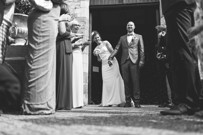 Vervolgens trokken het bruidspaar en hun suiteleden naar een pittoresk kerkje dichtbij hun woning voor de kerkelijke ceremonie. Anne-Sophie vertelt: “Voor het kerkelijk huwelijk werkten we samen met een ceremoniemeester; dit paste volledig in ons concept van een traditioneel huwelijk. Wen De Lathouwer van De Feestmaker zorgde er onder andere voor dat de suite in de juiste volgorde de kerk binnenkwam, en wees de plaatsen aan. Hij was het centrale aanspreekpunt voor onze entourage en leveranciers, waaronder de fotograaf en de feestzaal. Zo werden er op de dag zelf geen praktische vragen aan ons gesteld en hoefden wij niet bereikbaar te zijn op onze gsm.”