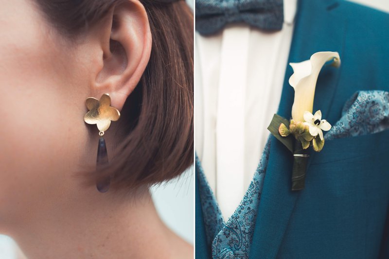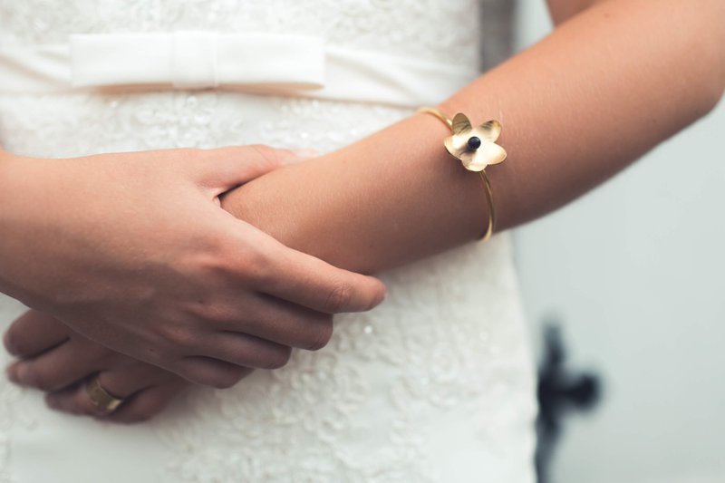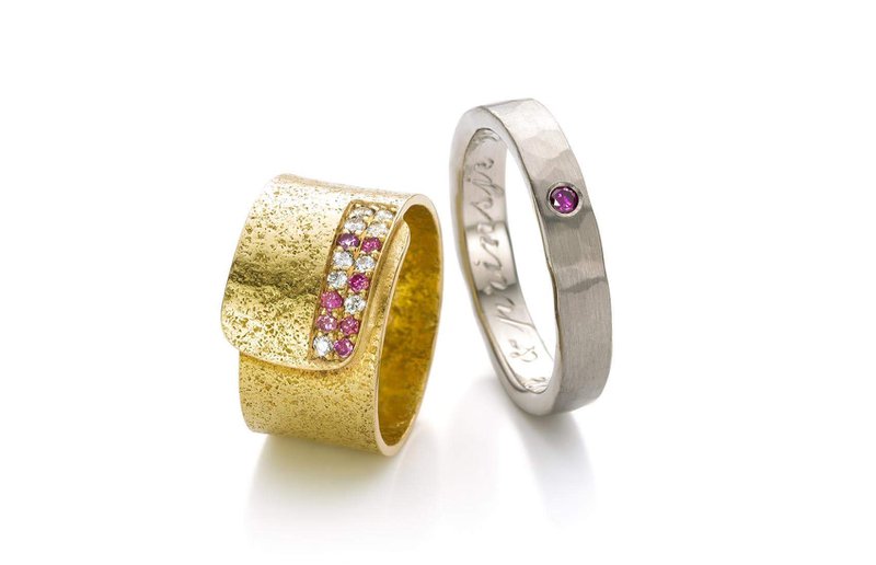 Het bruidspaar zocht een goudsmid en juwelenontwerper die hun persoonlijke verhaal kon vertellen in hun verlovingsring en trouwringen. Die vonden ze in Marie-Bénédicte Jewellery Design. Anne-Sophie licht toe: “In plaats van klassieke ringen wilden we ringen die mee evolueren met ons liefdes- en levensverhaal. Ook de prachtige kleuren in Marie-Bénédicte’s ontwerpen spraken me heel erg aan. Onze ringen zijn volledig uniek, inclusief de keuze van de diamanten. Ik droeg mijn trouwring initieel als verlovingsring. Alexander had hierin met de witte en paarse diamantjes een geheime code laten maken - ik kon tot aan onze trouw deze code niet kraken! Het bleek uiteindelijk binaire code te zijn met als betekenis het plusteken +, dat symbool staat voor onze relatie.”