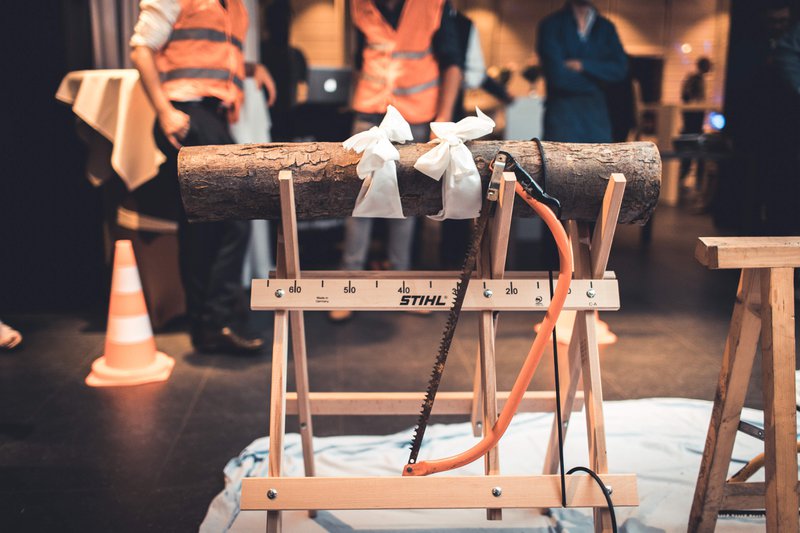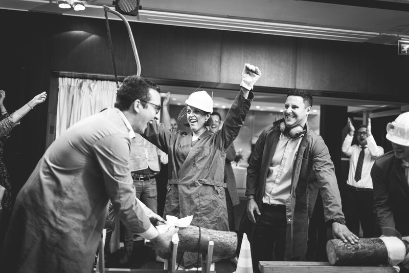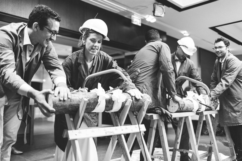 “Tijdens het diner kwamen Alexander’s vrienden plots de feestzaal binnen met twee houtzagen en boomstronken. Alexander en ik moesten toen elk in onze trouwkleding om het snelst een boomstronk doormidden zagen. Ik won en werd bijgevolg bekroond tot ‘de grootste zaag’. Dit was vast en zeker het meest spannende en grappige moment van ons trouwfeest!”, lacht Anne-Sophie.