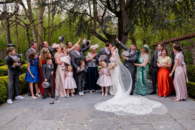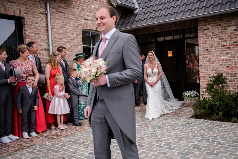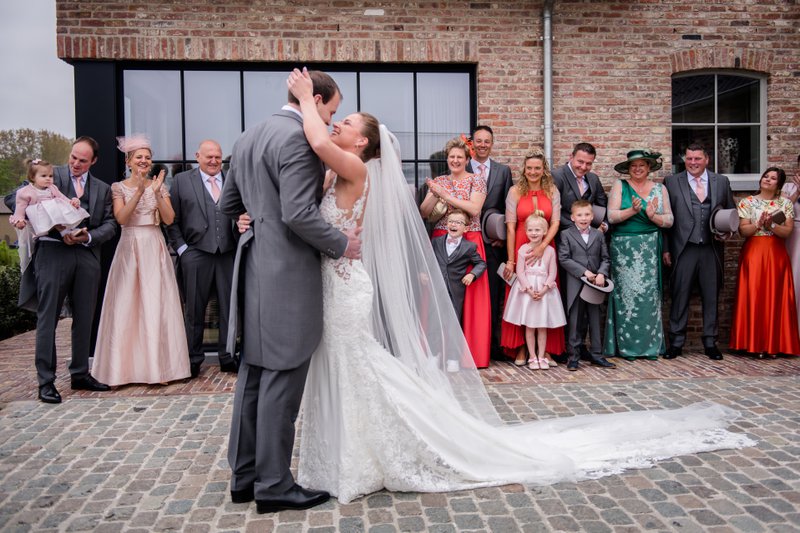 Na de prachtige plechtigheid trokken Laura en Karl met hun gasten naar de feestlocatie: Huyze De Baere in Maldegem. Laura vertelt: “De zaal is écht uniek: warm, verfijnd, en tegelijk groot genoeg voor al onze gasten. De prachtige binnentuin bleek perfect voor onze receptie. We waren mooi ingesloten, dus het waaide er niet en de zon kon zo mooi zijn werk doen. Met het mooie uitzicht op het erachter gelegen groene landschap was de sfeer direct top!”