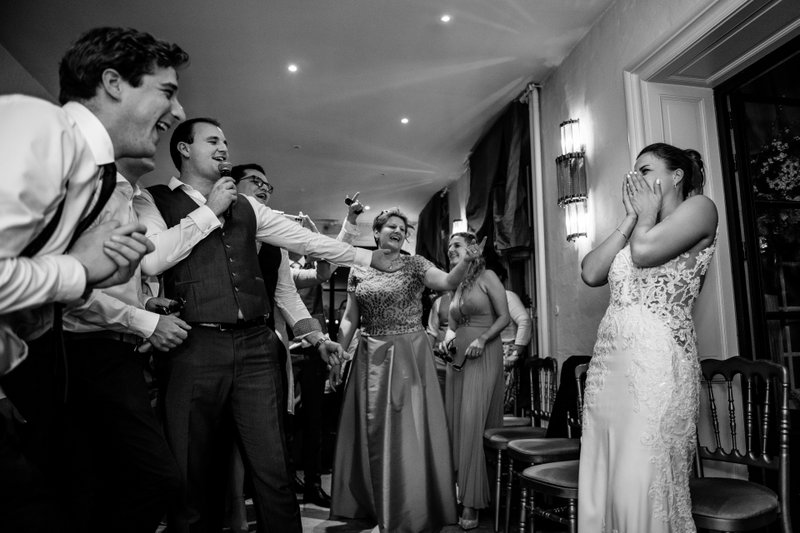 Tijdens het diner zorgde Karl voor een verrassing van formaat. Laura licht toe: “Tussen het voorgerecht en het hoofdgerecht werd ik geblinddoekt. Plots zong Karl, samen met zijn vrienden, de serenade uit Top Gun. We zijn grote fans van deze film en grapten vaak dat hij dit ooit in een café zou doen bij ons in de buurt. Nu deed hij het voor mij op ons huwelijksfeest, voor al onze gasten… Ik was totaal verrast!”