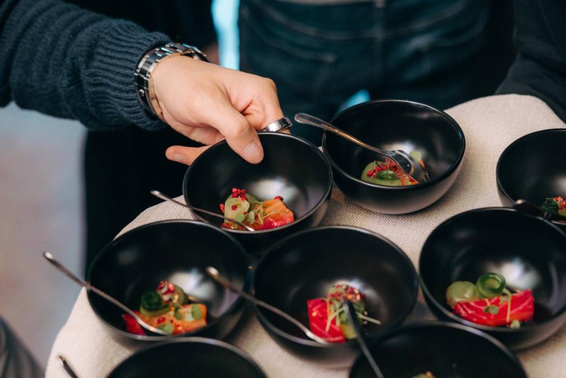 Blijven jullie liever niet zo lang aan tafel zitten? Dan raadt Very Food Catering ‘walking to you’ aan. Niki: “Bij ‘walking to you’ blijven de gasten rechtstaan en brengen we vier à vijf kleinere gerechten naar de statafels. Deze werkwijze zorgt voor een informele en levendige sfeer, waarbij gasten kunnen blijven rondlopen en praten. Dat maakt het voor het bruidspaar makkelijker om al hun gasten te begroeten. Voor wie toch graag even wil zitten, voorzien we extra meubilair zodat iedereen comfortabel kan genieten.”