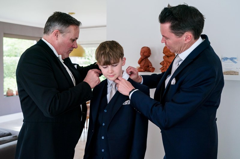 Johan koos dan weer voor een donkerblauw jacquet, gehuurd bij Vanwynsberghe in Kuurne. Ook hun mannelijke suiteleden droegen donkerblauwe jacquets van Vanwynsberghe, om alles mooi op elkaar af te stemmen voor een klassiek en stijlvol geheel.