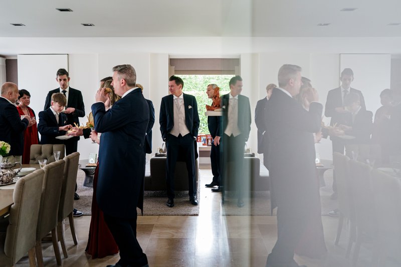 Isabel en Johan werden bij het klaarmaken bij hen thuis vergezeld door hun dichtste familie en vrienden. Hier dronken ze samen al een eerste glaasje bubbels, voor ze allen naar de kerk van Rijmenam trokken.
