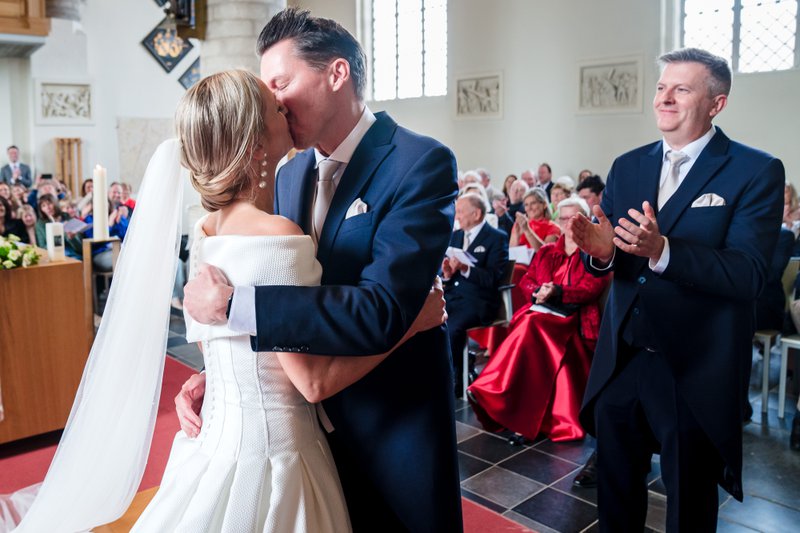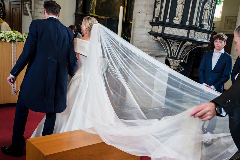 De kerkelijke huwelijksviering vond plaats in een warme sfeer vol betekenis. Isabel deelt: “Het was een heel mooie en persoonlijke kerkdienst, die in goede banen werd geleid door diaken Kris Somers.”