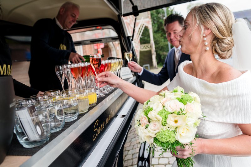 Na de viering werden de gasten bij het buitengaan van de kerk opgewacht door De Bubbelbar, een mobiele champagnebar die voor een feestelijke start van de namiddag zorgde. Isabel en Johan huurden de bar voor een uurtje; voor een originele, stijlvolle én praktische receptie vlak na het kerkelijk huwelijk.