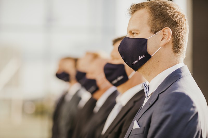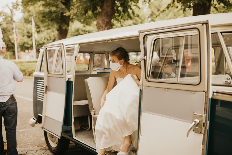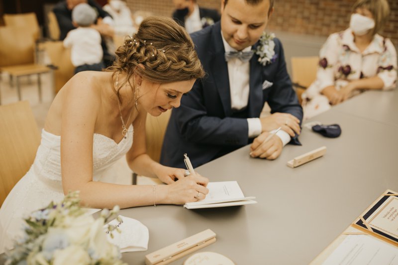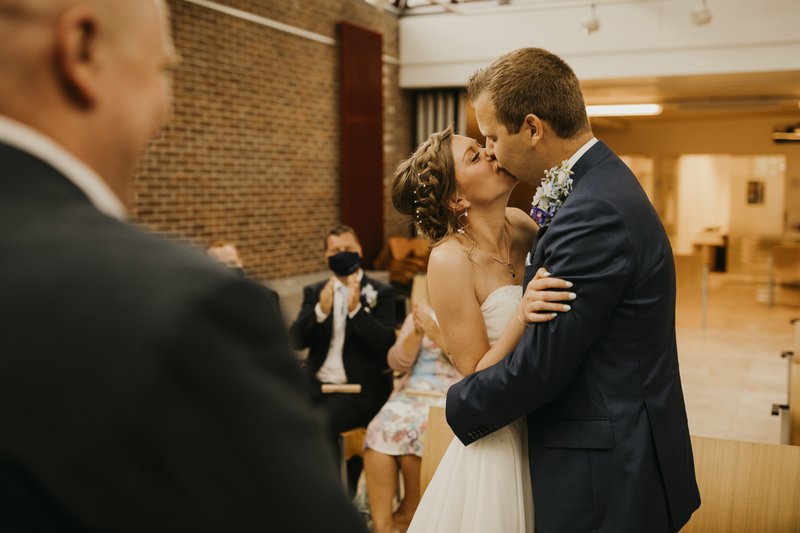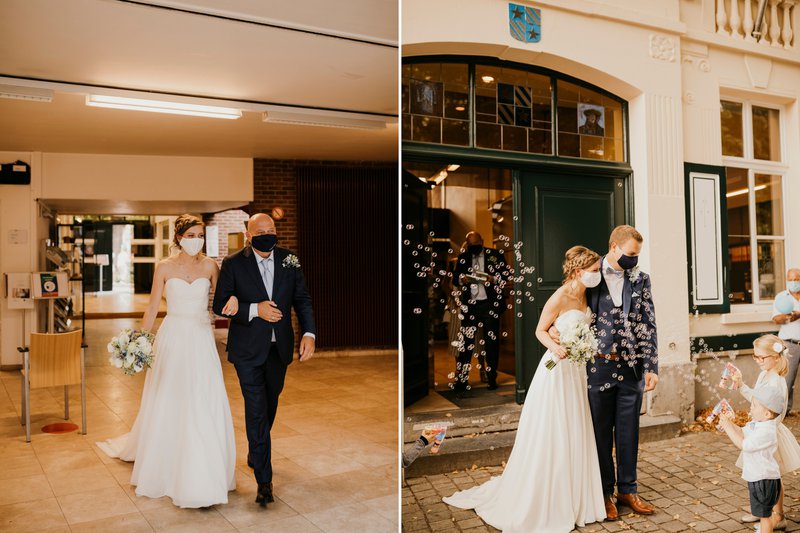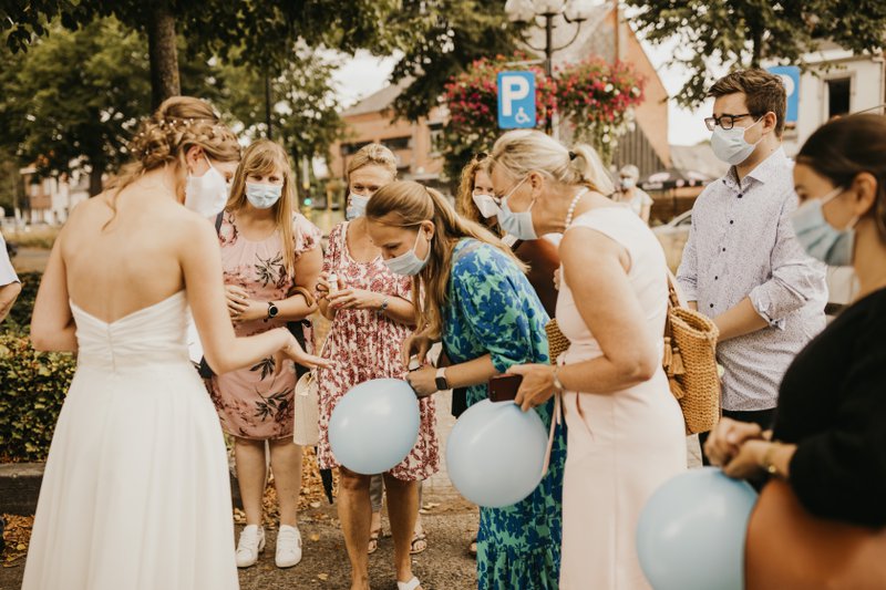 Eenmaal het koppel bij het gemeentehuis aankwam, stonden er vele familieleden, vrienden en collega’s die jammer genoeg niet mee naar binnen mochten. Maar hier hadden Paulien & Bram een oplossing voor: “Aangezien er slechts een kleine groep mee naar binnen mocht, hadden we samen met Pauliens broer ervoor gezorgd dat ons huwelijk buiten gestreamd kon worden. Zo konden ook degenen die buiten stonden alles meevolgen. Het was zalig dat ook zij via deze manier alles mee konden beleven. Eenmaal we getrouwd waren konden we dan ook met hen, weliswaar vanop een veilige afstand, wat bijpraten.”
