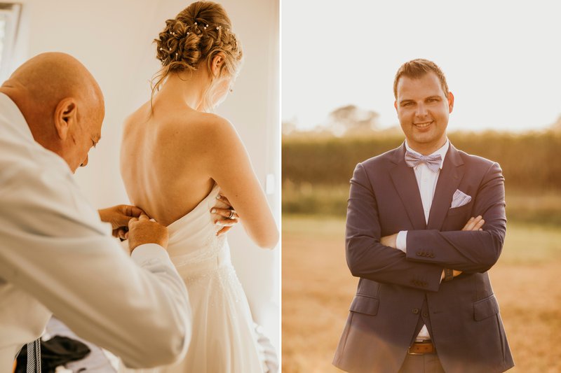 Qua kleding koos Bram voor een op maat gemaakt kostuum van Wellens Men in Herentals. Hij had al een tijdje op voorhand z’n kostuum laten maken, met hun originele trouwdatum als leuke extra erin verwerkt. “Jammer genoeg ging die datum niet door, dus koos ik ervoor om de datum eruit te laten halen. Aangezien de datum nog kon veranderen en we die niet veel op voorhand zouden beslissen, leek me dat de beste beslissing”, legt Bram uit. Paulien haalde haar trouwjurk uit dezelfde winkel als haar zus, bij Maxim's Couture in Aarschot. “Mijn zus kocht haar trouwjurk daar en praatte er altijd vol lof over. Toen ik er langs ging, had ook ik hetzelfde goede gevoel. Uiteindelijk was het ook liefde op het eerste gezicht met mijn trouwjurk!”, vertelt Paulien.