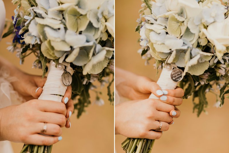 Een specifiek thema hadden Paulien & Bram niet voorzien, wel werd lichtblauw als accentkleur gebruikt. “Zowel ik als Bram vonden lichtblauw een mooie kleur, dus kozen we voor verschillende kleine details die in het lichtblauw waren. Bijvoorbeeld de schoenen, details in de strikken en dassen, maar ook alle kindjes hadden kleren aan waarin lichtblauw verwerkt zat. Ook mijn trouwboeket had verschillende lichtblauwe toetsen, maar hier speelde ook nog een belangrijke extra factor een rol. Aangezien mijn mama overleden is en ik haar er graag toch een beetje bij wou, hadden we een bedeltje laten maken met haar foto op. Dit hing aan mijn boeket, wat het extra speciaal maakte”, vertelt Paulien gelukkig.