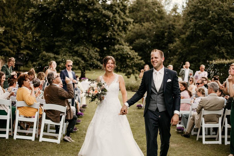 Is de ceremonie afgelopen na jullie eerste kus als pasgehuwden? Vertrekken jullie als eerste naar het feest? Voor kersvers getrouwde koppels is het moment vlak na de ceremonie vaak het meest verwarrend. De emoties gieren door je lijf en je gasten blijven zitten tot ze zeker weten dat ze mogen vertrekken. Oefen ook dit moment tijdens je repetitie, zodat je stressloos aan het feest kan beginnen!