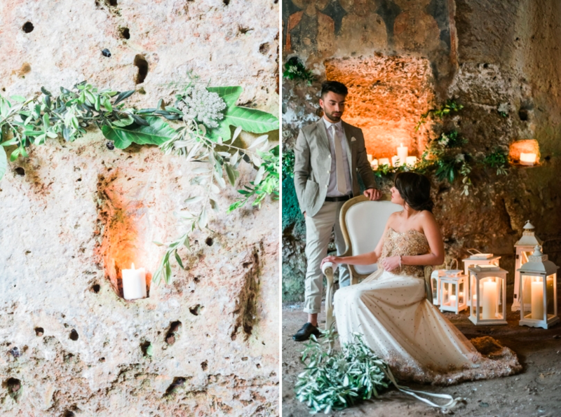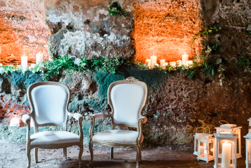 "Door de uitgestrektheid van de masseria konden we diverse sferen op totaal verschillende plaatsen laten ontstaan. Voor de ceremonie had ik mijn oog laten vallen op een geheime grot die vroeger verschillende functies had: een kerk, waarvan je de fresco’s nog kunt bewonderen, en later een schuiloord voor mens en dier tegen de invallen van de Turken. In en rond de voederbakken werden kaarsen en olijftakken geplaatst die als altaar dienst deden. Voor het bruidspaar werden de prachtige, op maat gemaakte houten stoelen van de masseria gebruikt. Ons hele team was sprakeloos bij het zien van deze plek."