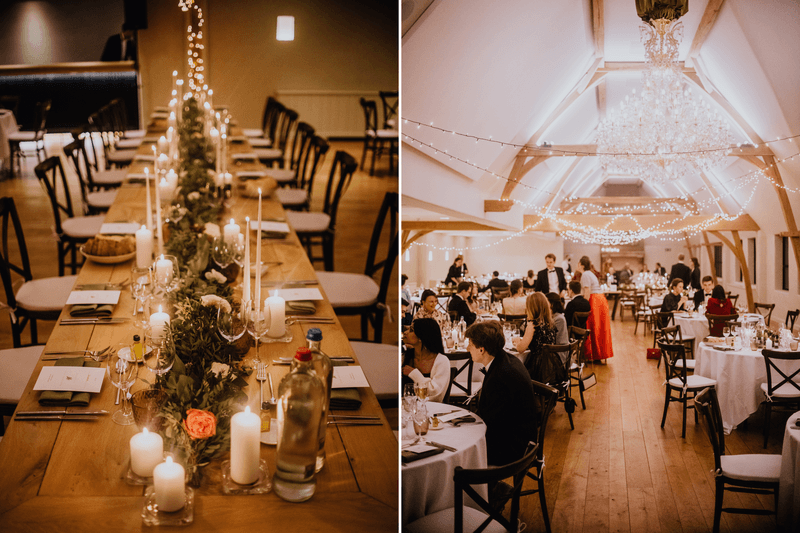 Delphine en Jean-Baptiste hadden een duidelijk beeld van hoe hun huwelijk eruit moest zien: “We wilden gaan voor winters warm, met veel lichtjes en kaarsjes. Als kleuren wilden we veel groen, maar ook zacht roze, warm wit en bordeaux.” Voor de uitwerking van hun wedding styling konden ze rekenen op het advies van Carte Blanche. “Julie en haar man wisten meteen wat wij bedoelden met winters warm en hebben de kerk en de zaal super gezellig aangekleed. Ze zijn echte sfeerarchitecten, zoals ze het zelf omschrijven”, legt Delphine uit. “We vonden de styling en de sfeer heel belangrijk, en als je je goed laat omringen is veel mogelijk op eender welke locatie”, vertelt Delphine.