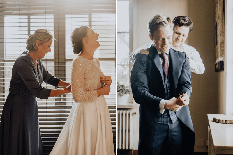 Geef toe: hebben we niet allemaal al eens (stiekem) gedroomd over hoe onze droom trouwjurk eruit moet zien? Wel dat deed Delphine ook, en nu was het eindelijk zover… Delphine liet haar trouwjurk maken bij Eva Janssens. “Ik volgde Eva al heel lang op Instagram, voor als het dan eindelijk mijn beurt was om zelf een trouwjurk te kiezen. Na ons eerste gesprek tekende zij meteen mijn volledige droomjurk uit”, glundert Delphine. Zij koos bewust voor #iktrouwbelgisch en zou Eva Janssens aan iedereen willen aanraden. “De persoonlijke aanpak en de prachtige stoffen hebben mij en mijn mama onmiddellijk overtuigd. Ook mijn lingerie, sluier, truitje en sjaal heb ik bij haar gekocht. Mijn trouwlaarsjes, tot slot, heb ik gekocht bij Atelier Content”, legt Delphine uit. Ook Jean-Baptiste wist al heel goed wat hij wou. Een klassieke jacquet van bij Wynsberge in de streek.