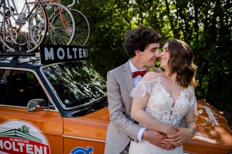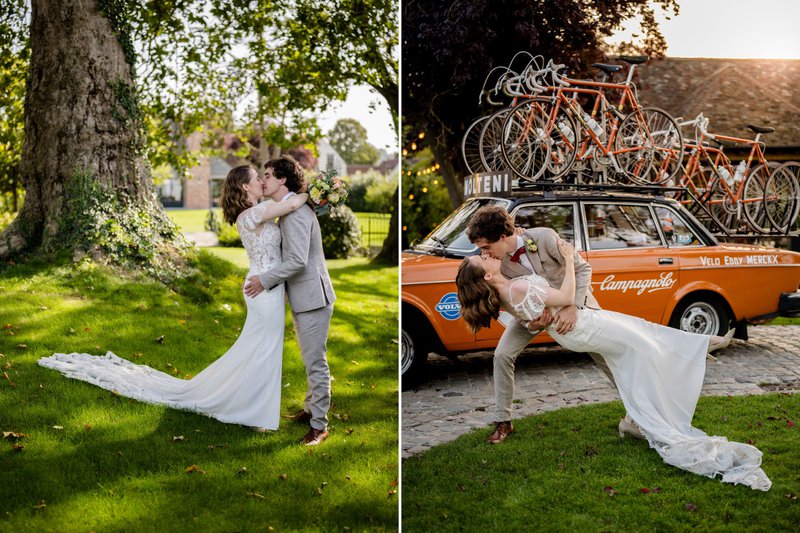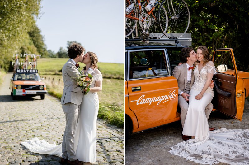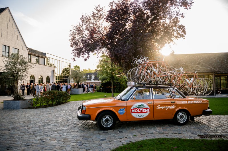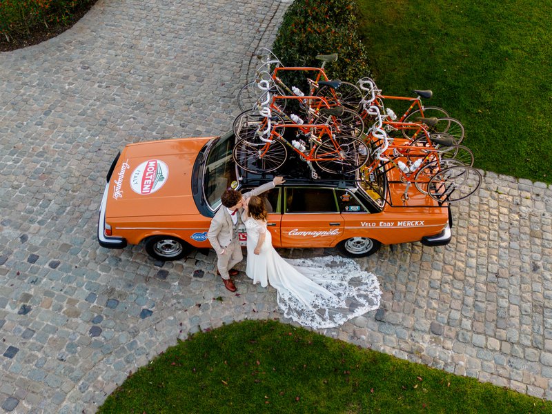 Ellen en Bart hadden al snel het perfecte plaatje in gedachten voor hun trouwfeest: “We houden beiden heel erg van het najaar en van herfstkleuren, dus kozen we ervoor om in de herfst te trouwen. We hebben een eigen fietsenwinkel, waardoor het voor ons in het voorjaar of de zomer iets te druk ging zijn om dan te trouwen. Voor ons huwelijksfeest wilden we eigenlijk zo weinig mogelijk verwijzingen naar ‘fietsen’. Het enige wat we wél graag wilden ... was de originele Molteni volgwagen, die onder meer Eddy Merckx ondersteunde tijdens zijn vele overwinningen!”, vertelt Ellen enthousiast.