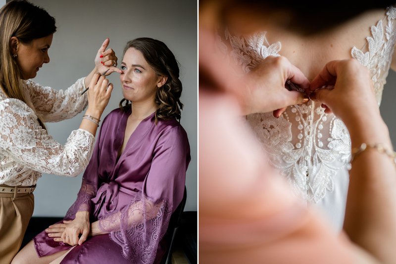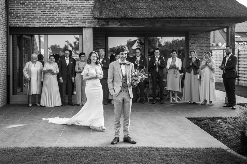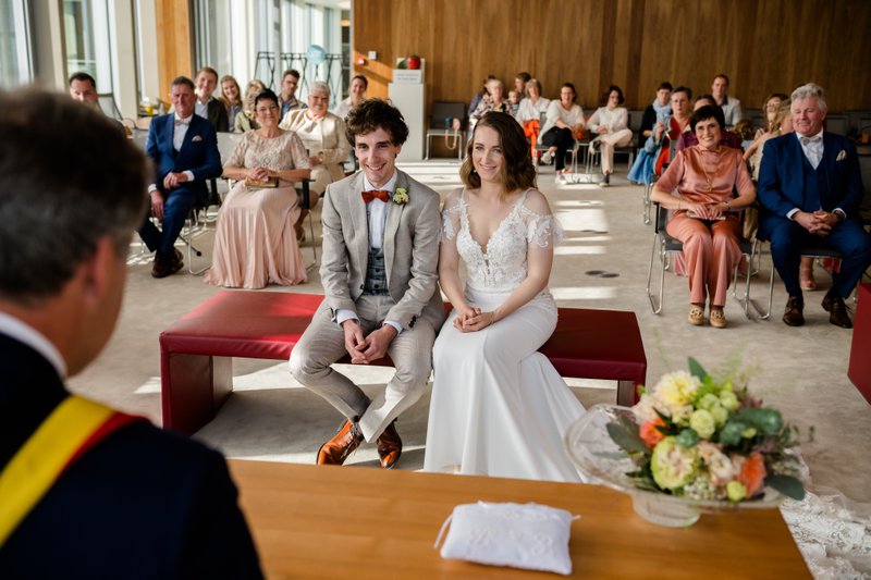 Ellen en Bart’s trouwdag ging op 7 oktober 2023 helemaal stressvrij van start. Ellen: “De avond vóór ons feest sliepen we apart, en ‘s ochtends maakten we ons ook apart klaar. Lauren Bracke en haar team stonden al vroeg paraat om mij en mijn suiteleden mooi op te maken. Om 10u15 zagen Bart en ik elkaar dan voor het eerst. Na onze first look trokken we naar het stadhuis van Deinze voor ons wettelijk huwelijk.”