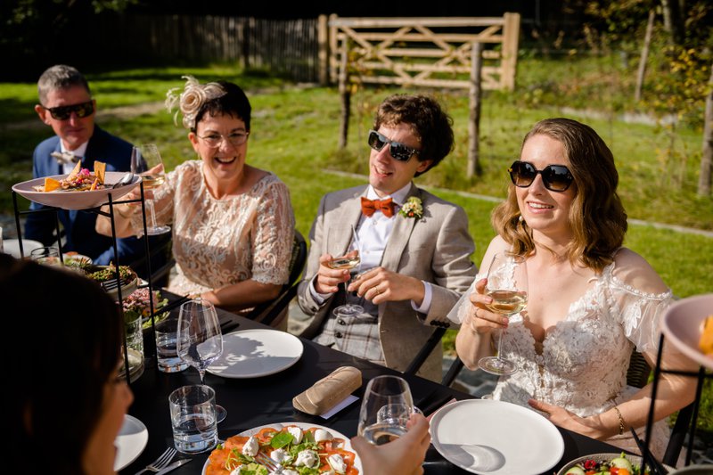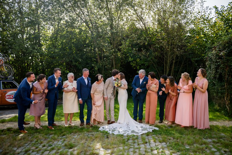 Ellen gaat verder: “Rond de middag genoten we met onze dichtste vrienden en familie van een zalige lunch in B&B Duisbeke in Mater. We konden het eten hier laten verzorgen door onze vrienden Benjamin en Jill van Cosy Food, die we graag wilden betrekken in onze huwelijksdag. Dit was een prachtig moment! Het was een zonnige dag met zo’n 23 graden, de tafel buiten was mooi gedekt en het eten was héérlijk. Ook lieten we de Molteni volgwagen hier als verrassing toekomen, waarop er al een klein fotomoment volgde met huwelijksfotografe Annelies van Annelies Photos.”