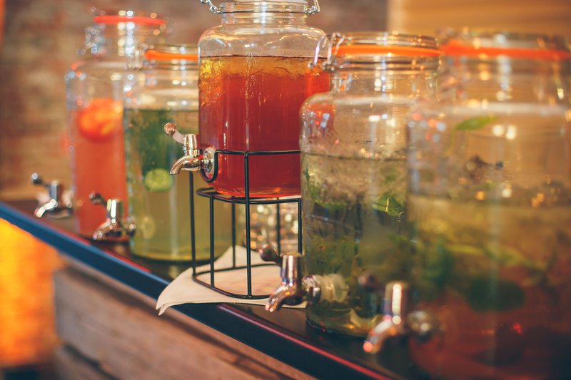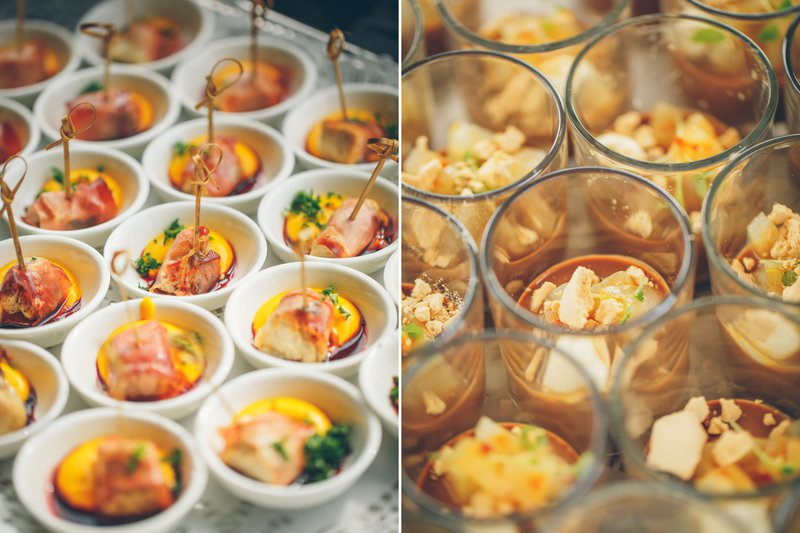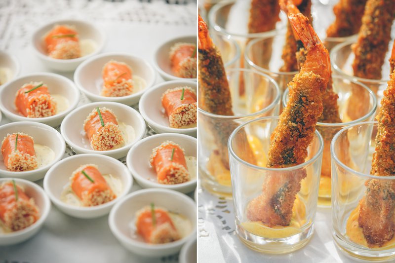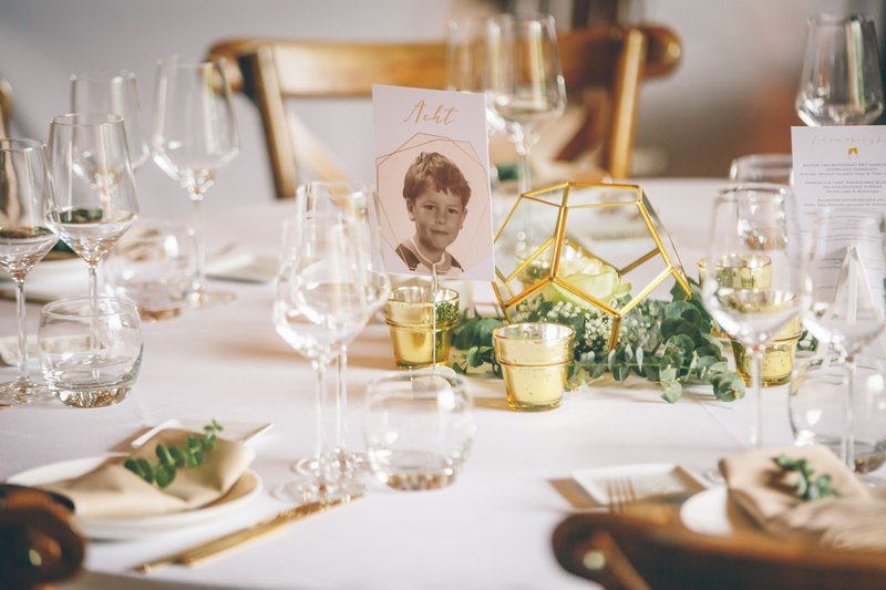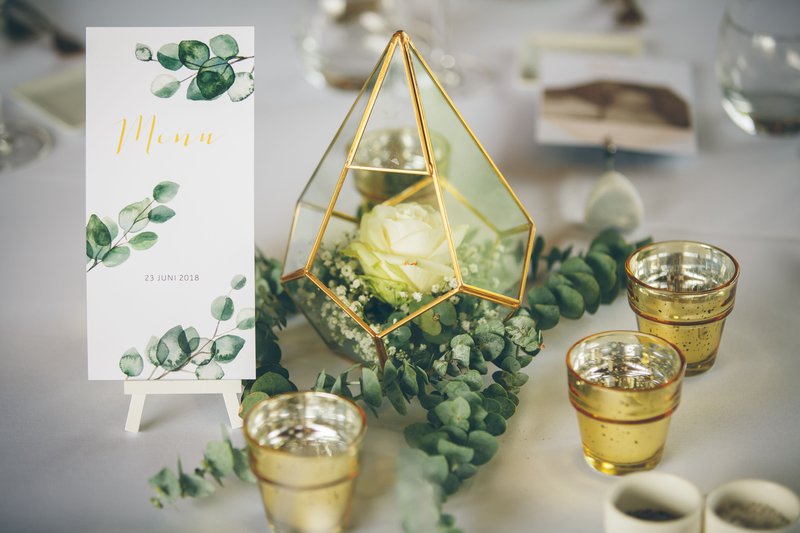 Zowel in de bloemen, de decoratie, de uitnodigingen als in de menukaarten was een vleugje goud verwerkt, in alles werd dezelfde stijl doorgetrokken. D’s Deldycke Traiteurs gaf daarbij ook de juiste aanvulling door bijvoorbeeld cocktails en mocktails in jars aan te bieden.