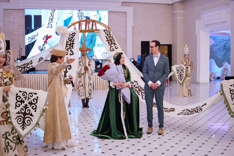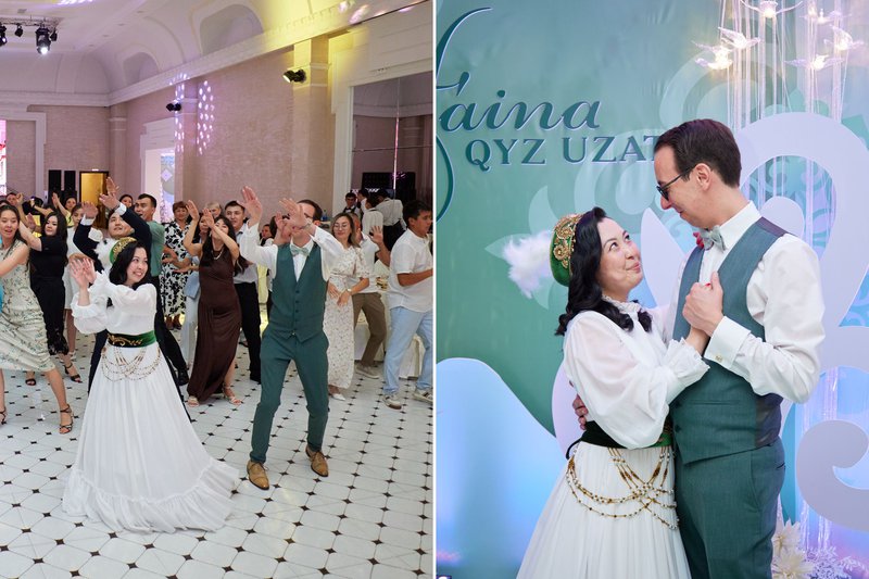 Faina en Maxim vierden hun huwelijk op maar liefst drie momenten, waarvan het eerste feest plaatsvond op 27 juli 2025 in Kazachstan - in de vorm van een traditionele Qyz Uzatu, een ‘bridal farewell’. Faina vertelt meer over de Kazachse traditie: “Het is een traditie waarbij de bruid haar familie verlaat en zich aansluit bij de nieuwe familie van haar man. De bruiloft was aangekleed in olijfgroene kleuren en vond plaats in een prachtig restaurant met zo’n 120 gasten. Voor elke Kazachse bruiloft is het belangrijk om een Tamada of ‘showman’ te hebben, die het hele evenement van begin tot eind leidt.”