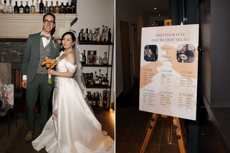 Voor de pasgehuwden was het belangrijk dat hun gasten met elkaar zouden kennismaken en gesprekken met elkaar zouden aangaan. Faina vertelt: “We wilden echt dat iedereen één grote groep zou vormen. Daarom voorzagen we enkele spelletjes tijdens de receptie, om het ijs te breken. We maakten kranten met ons liefdesverhaal, met een boodschap als bedanking voor elke gast en met kruiswoordraadsels. We deelden mensen op in teams met gasten die ze niet kenden; zij moesten samenwerken om wachtwoorden te ontcijferen.”