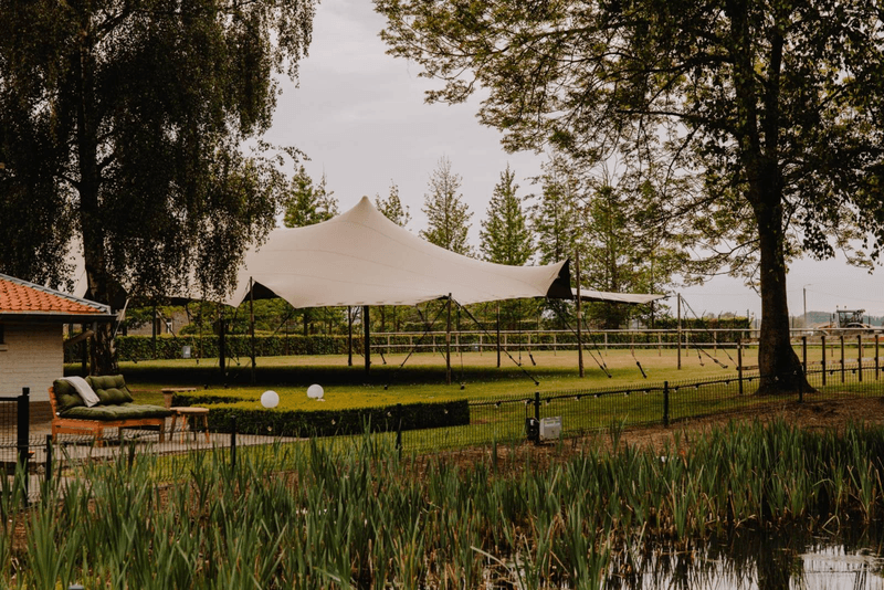 Wie droomt van een zomers huwelijksfeest in de buitenlucht, vindt in de Colliemolenhoeve nabij Roeselare de perfecte setting. Het domein ligt volledig omgeven door groen en water, en ademt rust en charme. Tijdens de warme maanden vormt de ruime stretchtent in de tuin een sfeervol decor voor een receptie of diner, terwijl de vijver en het omliggende landschap zorgen voor een romantische achtergrond.