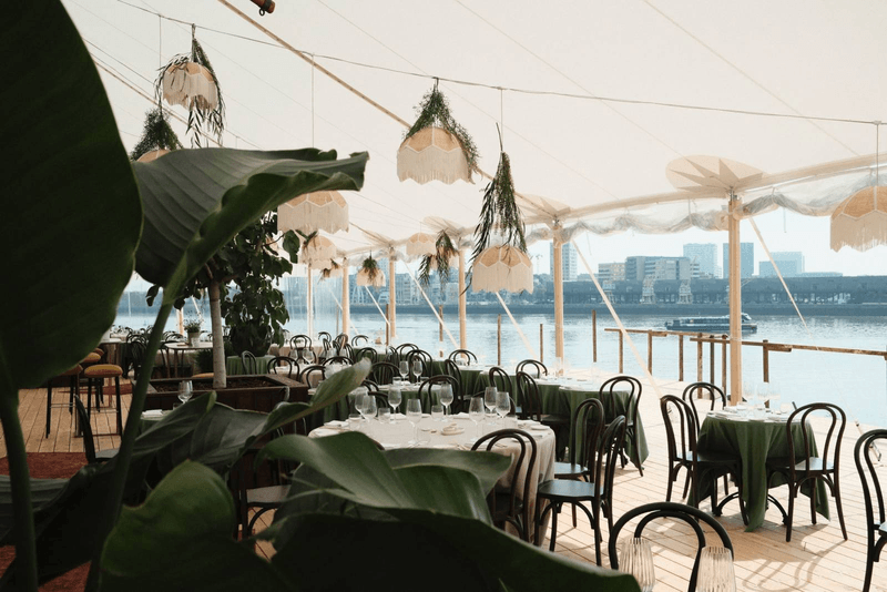 Club Royal op Linkeroever combineert de rust van de Schelde met een spectaculair uitzicht op de Antwerpse skyline. Van mei tot oktober vormt de lichte tuintent, omringd door groen, het hart van zomerse huwelijksfeesten: een stijlvolle openluchtsetting voor een ceremonie, diner of avondfeest tot wel 400 gasten. Ook de zonnige terrassen en ruime buitenzones maken van elk feest een totaalbeleving in de open lucht, met water en stad als unieke achtergrond. Hier vieren koppels hun liefde in een elegante maar ontspannen sfeer, waar natuur en stedelijke klasse elkaar moeiteloos aanvullen.