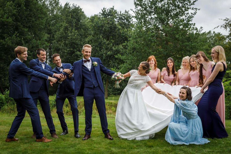 “Wij zijn echte familiemensen en dankzij onze vrienden en familie was onze trouwdag pas echt onvergetelijk”. Zowel bij de voorbereiding als op de dag zelf speelden zij een belangrijke rol. “Wij kozen niet voor een wedding planner. Tom en ik nemen de touwtjes graag zelf in handen. We hebben wél heel veel hulp gekregen van mijn bruidsmeisjes, van mijn vriendin Anne-Sophie en van mijn buurvrouwen. Niets was hen te veel gevraagd! En zo hadden we ook heel veel plezier. Het was heel fijn om samen met mijn vriendinnen (en met Tom) te overleggen en om de beslissingen niet alleen te moeten nemen”. Ook tijdens de huwelijksviering namen zij actief deel. “Mijn nonkel en mijn nichtje hielden de eerste lezing, onze zussen en mijn papa gaven een mooie speech waarbij mijn papa een zelfgeschreven gedicht voorlas. Onze goede vriendin Anne-Sophie deelde de ringen uit. Mijn beste vriendinnen van tijdens mijn studententijd waren mijn bruidsmeisjes en namen die taak met veel enthousiasme op zich. Ze stonden de hele dag klaar voor mij en samen hebben we heel erg veel plezier gehad”.