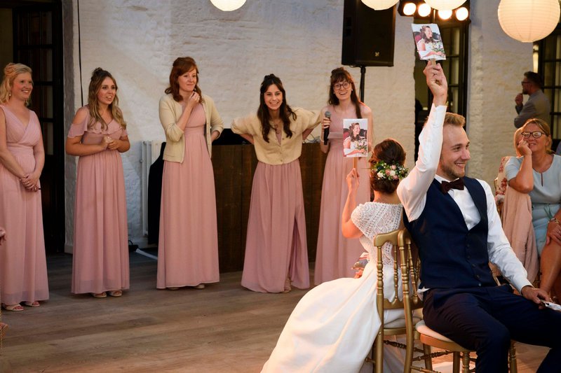 De bruidsmeisjes wisten Femke & Tom bovendien ook nog te verrassen met een leuk spelletje: “Er werden vragen gesteld over ons zoals ‘wie kan het beste autorijden’, ‘wie is het snelst kwaad,’… De gasten konden mee nadenken en wij moesten een bordje in de lucht steken met ‘Tom’ of ‘Femke’. We raakten er samen uit en behaalden een hoge score! We zijn dus echt voor elkaar gemaakt! En de bruidsgasten maar lachen met ons!”, blikt Femke enthousiast terug.