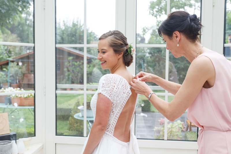 Ook bij de zoektocht naar de trouwjurk speelde de mama van Femke een belangrijke rol. “Mijn trouwjurk ben ik samen met mijn mama en zus gaan uitkiezen bij La Sposa in Roeselare. Ik vond deze zaak via House of Weddings en was direct overtuigd, zeker omdat ze hun eigen naaiatelier hebben”, vertelt Femke. “Er werden al snel heel wat jurken uit de kast gehaald en gepast! Mijn mama en ik hadden de jurk die het uiteindelijk zou worden, onafhankelijk van elkaar, aangekruist in de catalogus. Toen ik deze jurk aantrok, hadden we allemaal meteen een WAUW-gevoel. De keuze was dus vrij snel gemaakt!” Het werd een romantische prinsessenjurk van het merk Rosa Clará. “Ik koos voor een echte baljurk met een kanten lijfje bezet met glinsterende pareltjes, romantische open rug en een sleep”.