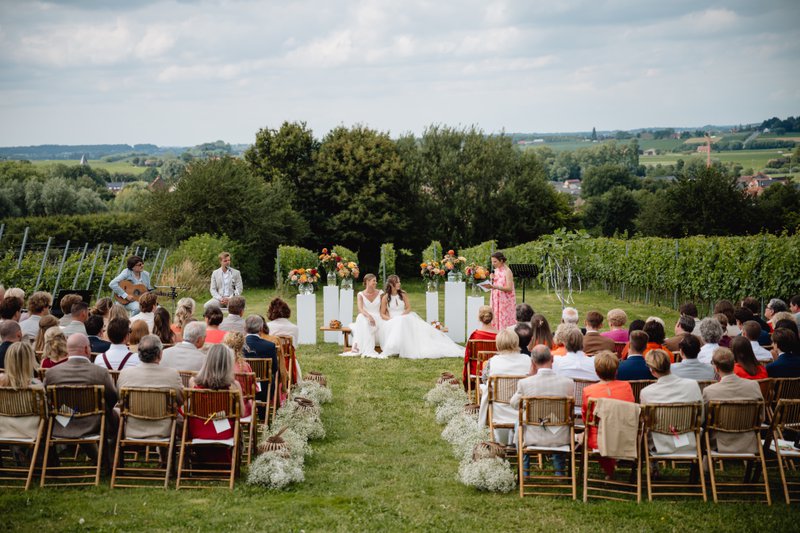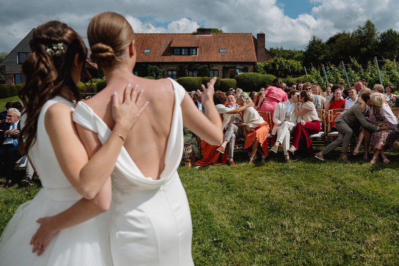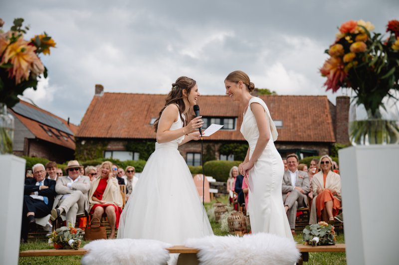De ceremonie was zonder twijfel het meest ontroerende moment van het hele weekend. Fien en Marie staken deze volledig zelf in elkaar en vroegen aan Fien haar zus om de ceremonie te leiden. “Dat maakte het heel persoonlijk,” deelt het bruidspaar. “Onze gasten spraken ons er achteraf ook over aan: de liefde was echt voelbaar.”