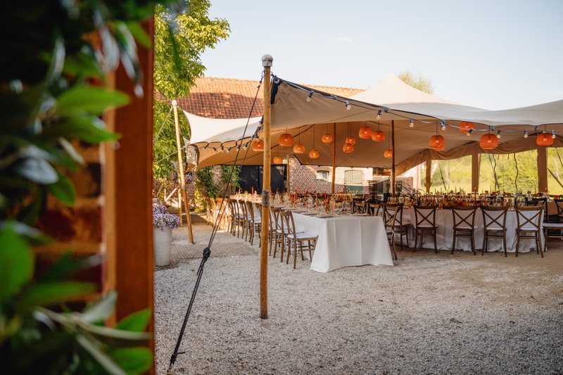 De aankleding van locatie Heerlyckheyt Roonenbergh werd voor deze dag tot in de puntjes verzorgd door Justine van Just Us. Fien vertelt: “Justine, de vrouw van onze cateraar Bart Biebauw, zorgde voor de volledige aankleding van het feest. De tent opzetten, de tafels dekken, afspreken met leveranciers, enzovoort nam zij voor haar rekening. De catering door Bart Biebauw en de organisatie van Justine vormden voor ons een totaalpakket.” Picobello bezorgde daarbij het meubilair, tafellinnen en de decoratie. Alles ademde elegantie en eigenheid, en paste perfect bij Marie en Fiens stijl.