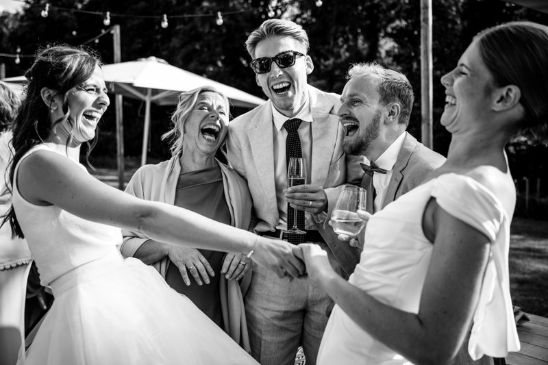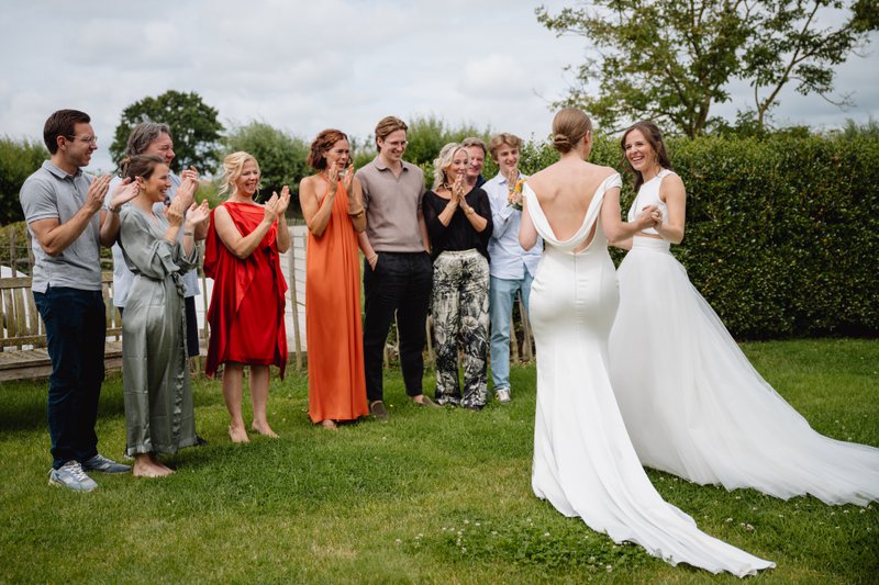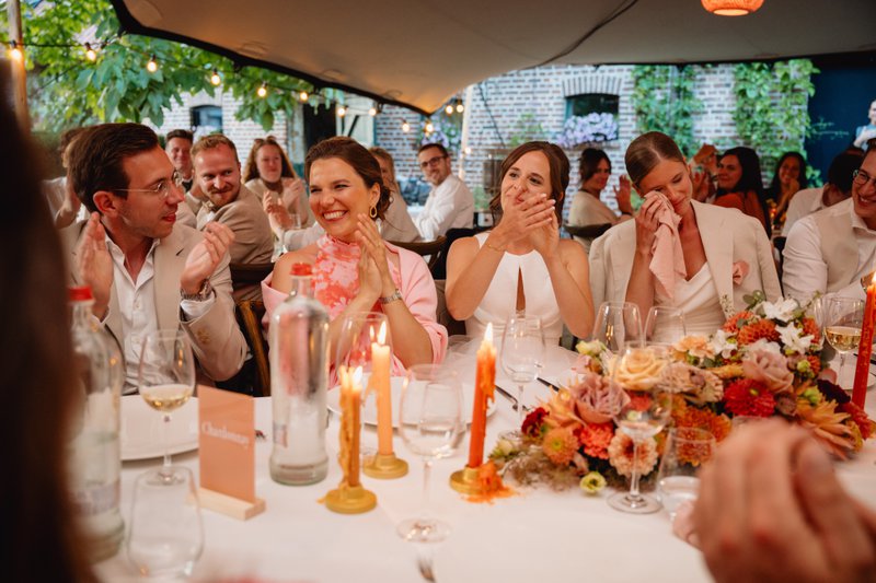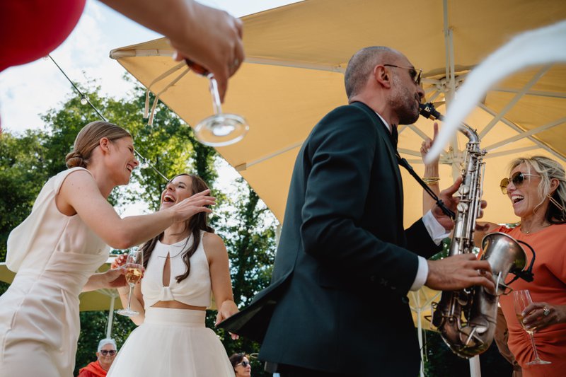 Na de ceremonie ging het feest naadloos verder. Fien en Marie besloten om geen aparte receptie te houden voor de vrienden van hun ouders — alle genodigden bleven daarentegen van begin tot eind. “Zo bleef de sfeer erin,” leggen ze uit. “En onze saxofonist Louis Barocco van partysax.be bracht meteen ambiance op de receptie. De live muziek was echt een goede keuze.” Onder de zomerzon genoot iedereen van de muziek, fijne gesprekken en een ontspannen sfeer.