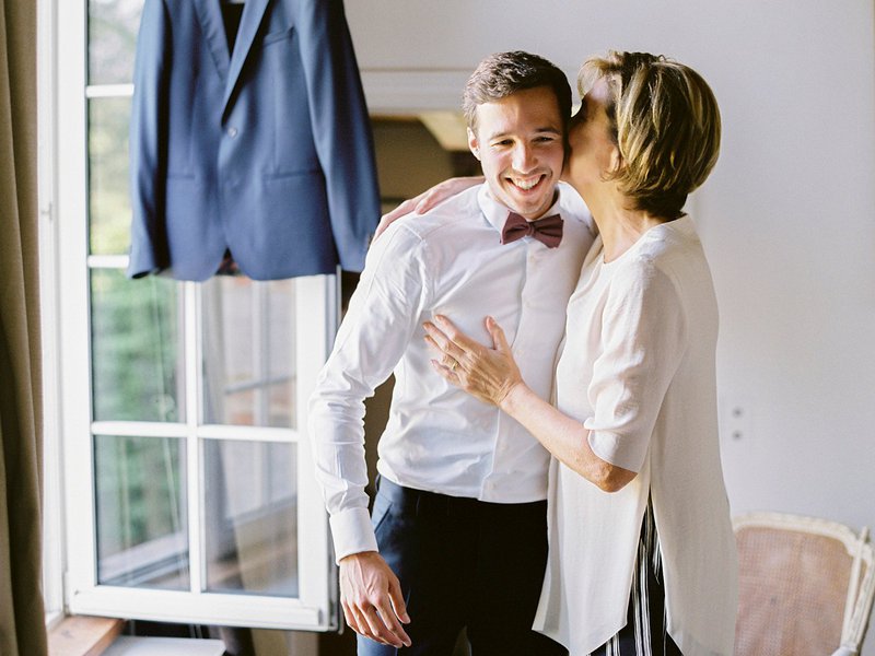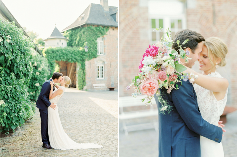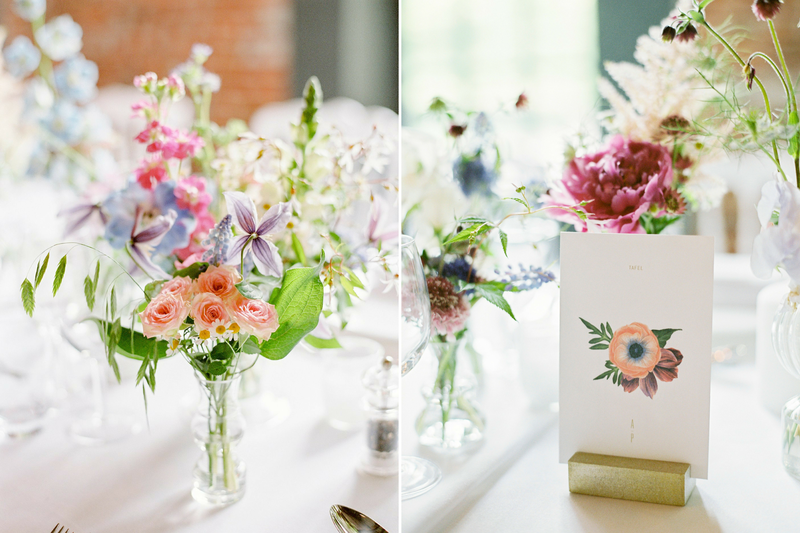 De suite kreeg het kleurenpalet van de bloemen - gaande van grijsblauw, lichtroze, fuchsia tot paars- mee als leidraad voor hun kledingkeuze. "Al snel bleek dat iedereen iets lichtroze had uitgekozen voor ons huwelijksfeest, wat de foto's alleen maar mooier maakte", zegt Alexandra enthousiast. "Voor de 160 overige gasten gaven we bij onze uitnodiging een kledingtip mee: Dress Up, Suit Up."