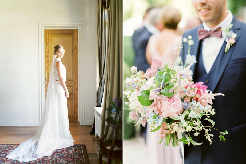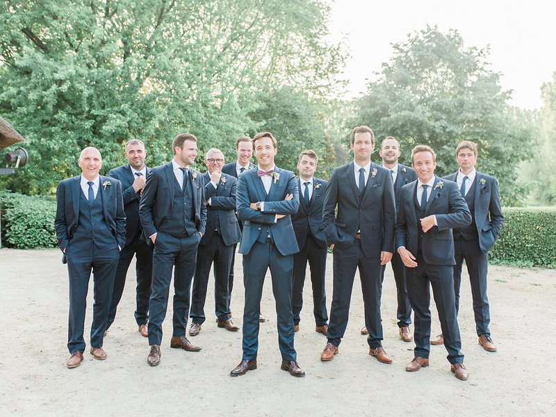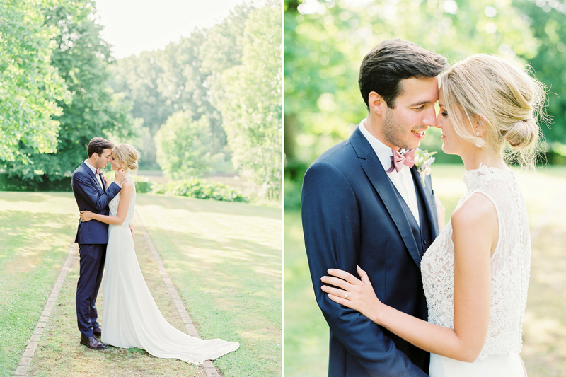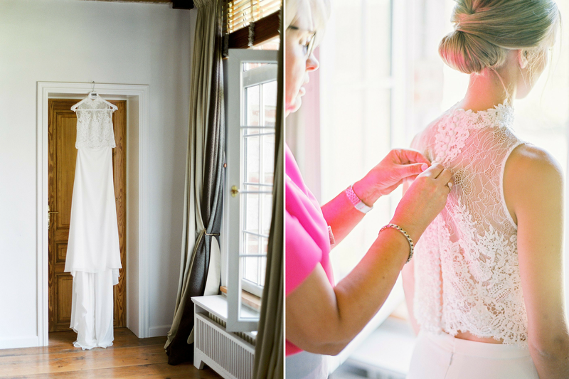 "Voor ons wettelijk huwelijk, twee weken vóór ons avondfeest, koos Pieterjan voor een opvallende outfit: een bruingrijs kostuum met een groene strik. Op onze grote dag, 26 mei 2018, wou hij liever iets klassieks en tijdloos. Hij koos voor een donkerblauw pak met paarse das van Café Costume." Voor haar jurk trok Alexandra samen met haar moeder, schoonmoeder, schoonzus en beste vriendin naar JPC Collection in Antwerpen. "Het uiteindelijke model van Rosa Clará dat ik koos, een aparte top en een rok, was eigenlijk iets anders dan wat ik initieel voor ogen had (open rug, lange mouwen, losse rok) Gelukkig kon ik bij JPC Collection de jurk een week nadien nog eens opnieuw passen - ik bleek tóch verkocht!"