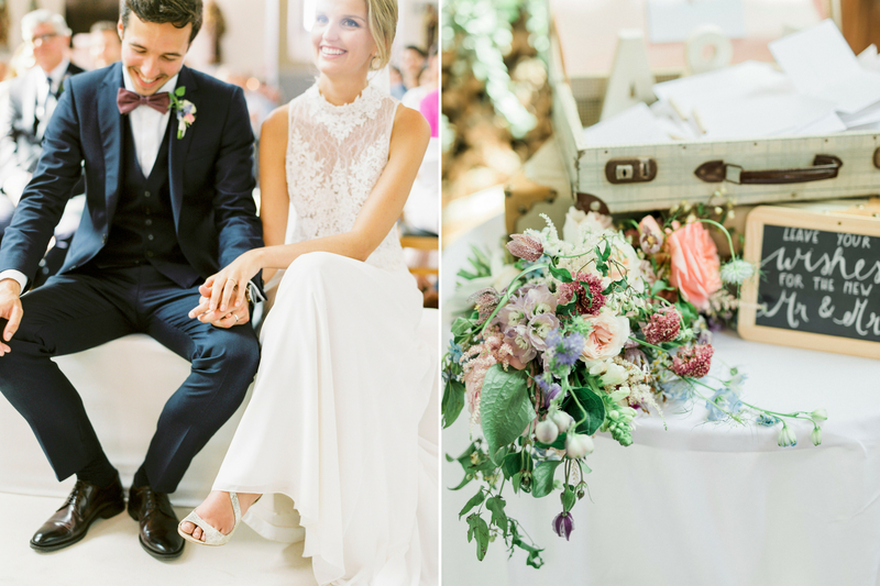 Alexandra en Pieterjan vonden het belangrijk dat de huwelijksceremonie een persoonlijke invalshoek kreeg. Daarom gaven ze hun eigen, persoonlijke toets aan de inhoud van de teksten die ze lieten voorlezen door dierbaren en naasten. "Samen met Virginie kwamen we op het idee om wenskaartjes uit te delen tijdens de viering. Zo kon elke gast er een persoonlijke boodschap op schrijven en zelf naar voren brengen", gaat Alexandra verder. "Dit zorgde onverwacht voor een intiem en warm moment, aangezien alle genodigden ons spontaan begonnen te kussen en feliciteren."