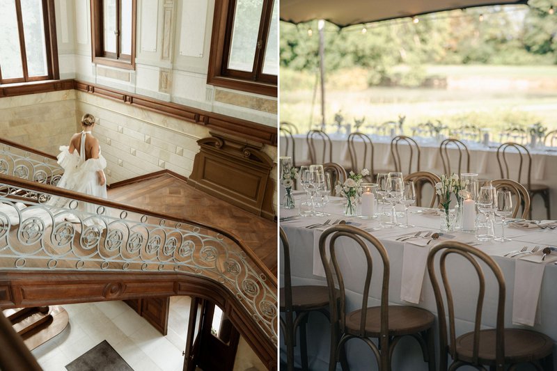 Een sterk locatiebezoek helpt om de trouwdag écht te visualiseren. “We leiden koppels rond volgens de structuur van hun dag,” zegt Marie. “We tonen waar de ceremonie, receptie, het diner en dansfeest kunnen doorgaan, en beantwoorden al hun vragen onderweg. Op het einde tonen we foto’s van eerdere trouwfeesten, zodat ze het totaalbeeld voor zich zien en de sfeer al kunnen voelen.”
