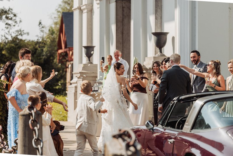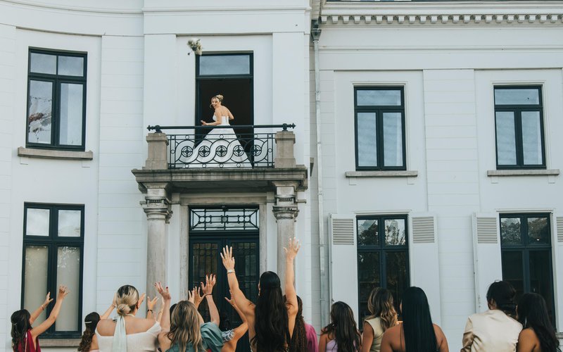 Een plek die van nature al erg sfeervol is, helpt koppels om zich hun feest al meteen goed voor te stellen. Marie: “Ons kasteel is al prachtig op zich en heeft eigenlijk weinig aankleding nodig. De ronde kamer bijvoorbeeld heeft bladgoud op de muren en een mooi patroon op de grond - met slechts een paar bloemen is die ruimte perfect. Fotografen laten zich graag inspireren door al dat schoon; zo blijft de draaitrap in de inkomhal een favoriete plek voor foto’s. Ook het koetshuis is heel idyllisch, met een schitterend uitzicht op het kasteel en de tuin.”