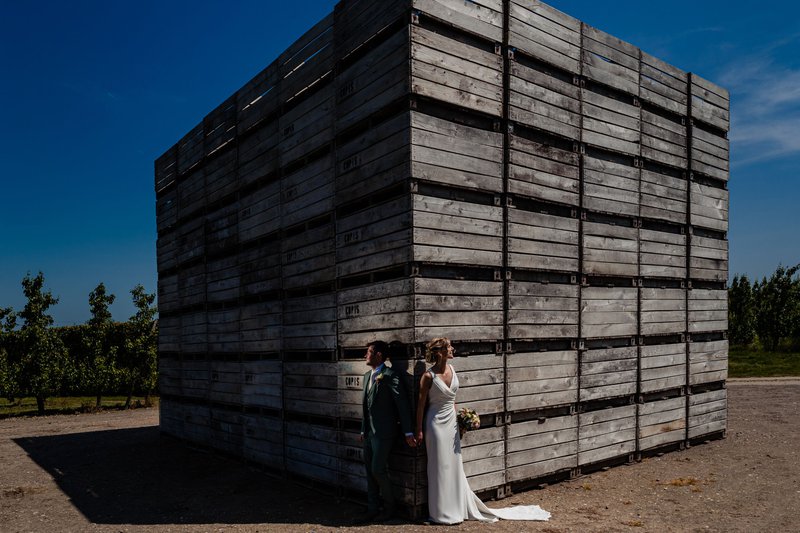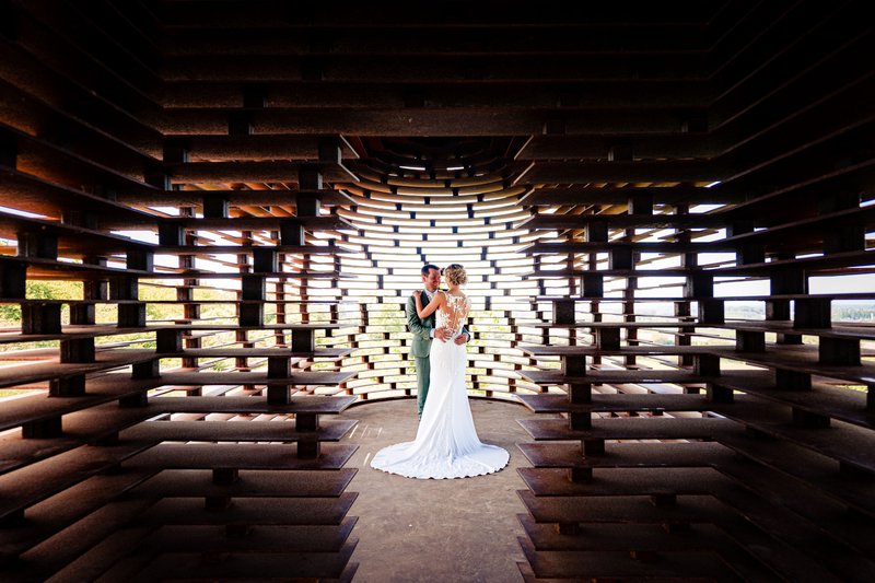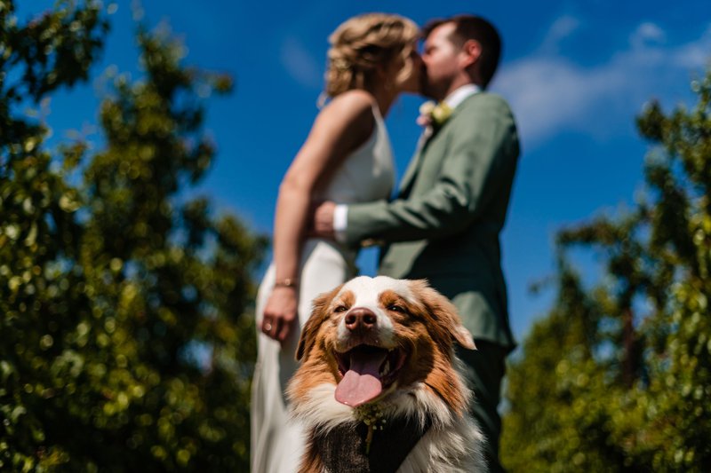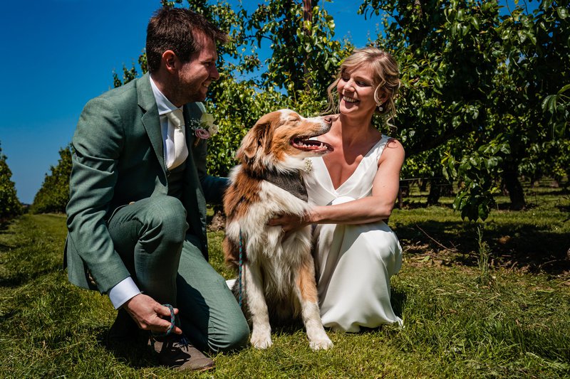 Na de plechtigheid trokken de pasgehuwden naar Borgloon. Ilse: “Hier, aan het doorkijkkerkje en tussen de fruitbomen, maakten we onze trouwfoto’s met huwelijksfotograaf Gaetan Dardenne. Onze getuigen waren erbij, alsook onze vrienden die dit weekend op onze hond Lio zouden letten; zij brachten Lio zelfs even mee, om ook op de foto’s te staan!”